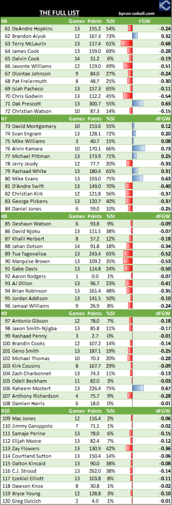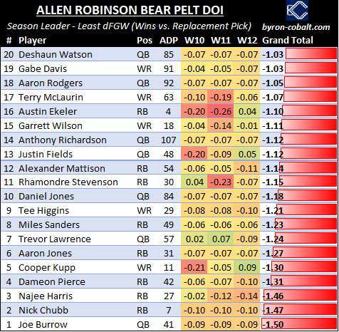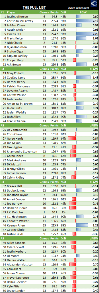 - Looking at low advance rates, it lines up well with the bottom of this list. Except for Najee (only here) and Jefferson (only there). I’m going to be thinking about that a lot in the offseason – is it noise, or can dFGW improve?