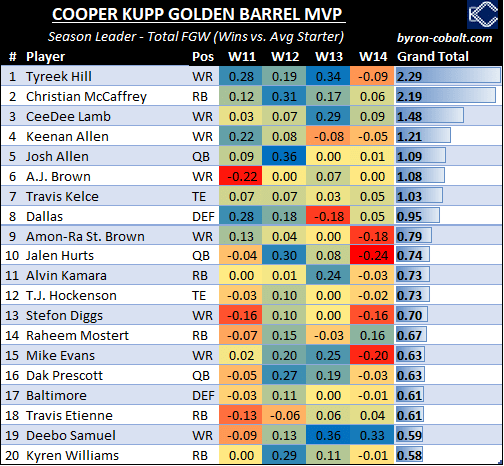 - Very strange that Tua is so low (-0.52) while Tyreek is so high (2.29). Partly why I keep expecting a Jaylen Waddle game before the season’s out.