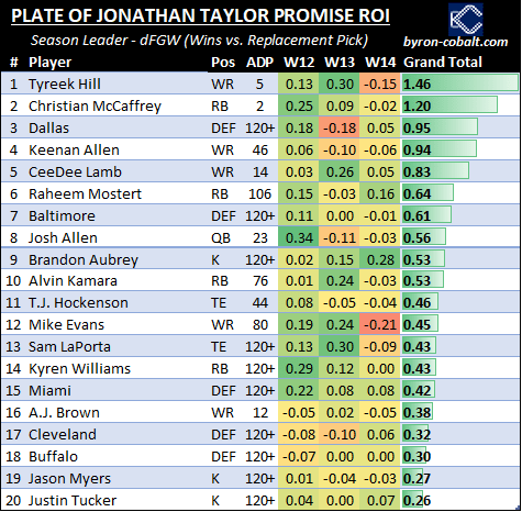 - Brandon Aubrey is above the top ROI kickers for both 2021 (0.50, Justin Tucker) and 2022 (0.45, Daniel Carlson and Tucker).